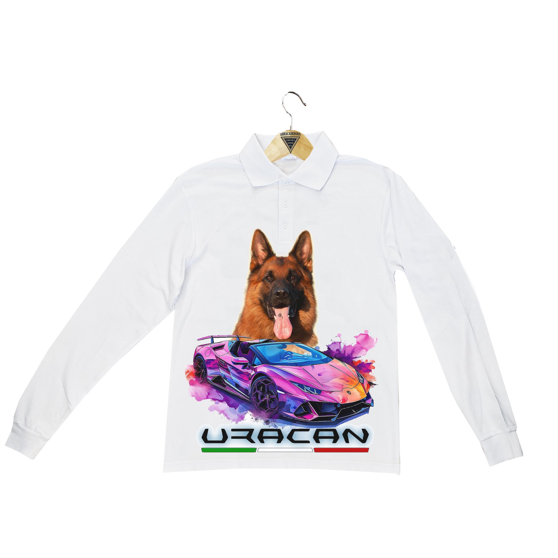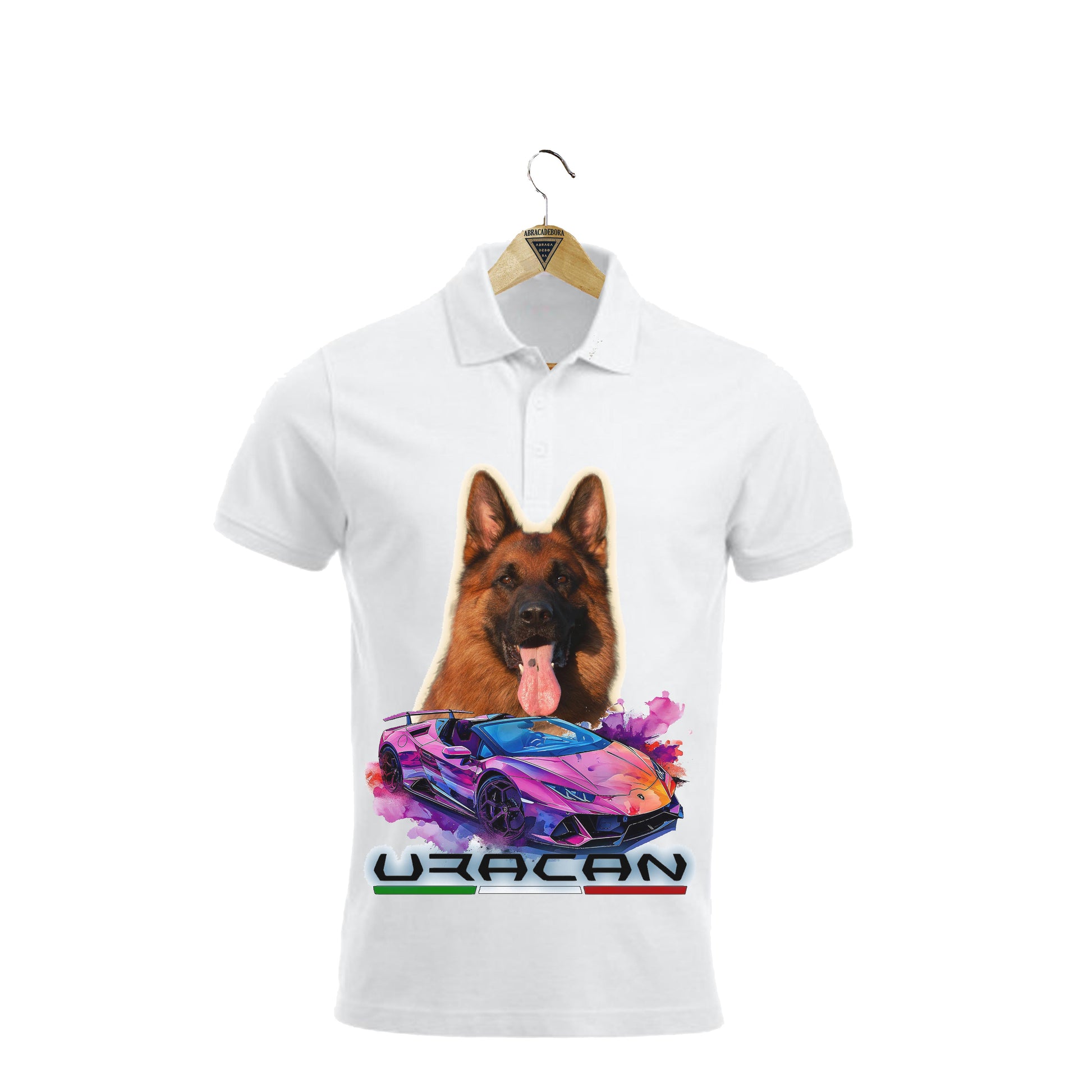 Realizzata in morbido cotone e dallo stile grintoso, questa polo è dedicata a Uracan Webachtal, figlio di Dalì Webachtal. Il nome, ispirato alla potente Lamborghini Huracán, si riflette in un design che combina sportività e potenza: la testa fiera di Uracan si affianca alla silhouette della supercar, creando un mix perfetto di forza, dinamismo e prestanza. Un capo esclusivo per chi ama i pastori tedeschi d’élite… e le auto che fanno battere il cuore!