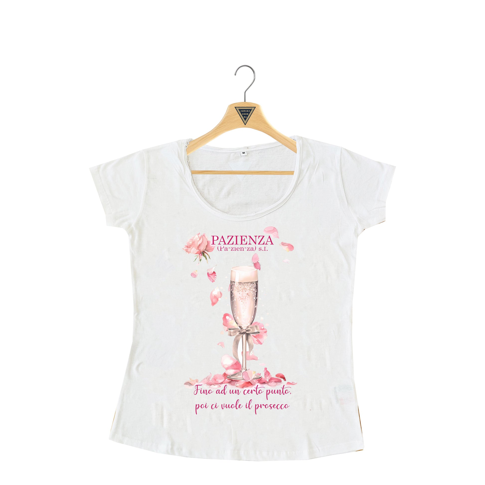 La scritta “Pazienza, s.f. … fino ad un certo punto, poi ci vuole il prosecco” racconta la verità universale di ogni donna multitasking: tolleranza illimitata, ma solo fino all’aperitivo.
